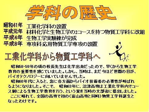 物質工学科の前身である工業化学科は、本校設置に5年遅れて、昭和41年にできました。平成元年には、バイオテクノロジーに関する教育課程を取り入れ、物質工学科になりました。平成8年には、専攻科・応用物質工学専攻ができ、実質上4年制大学と同じになりました。