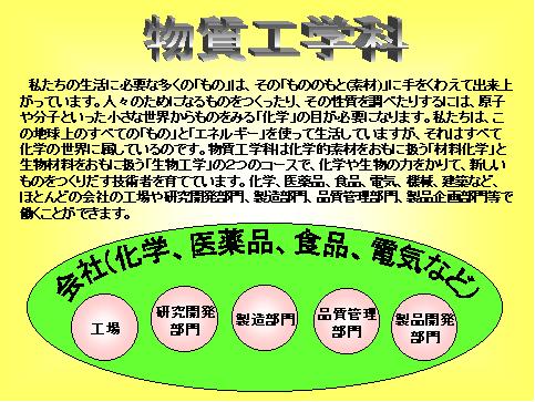 物質工学科では、金属などの化学的素材や微生物などから得られる生物的素材について、その性質を化学的に理解しそこから新しいものをつくりだす技術を身につけるための教育を行っています。