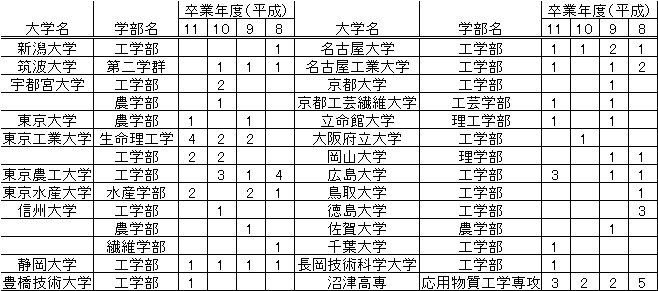 卒業生の大学への編入学については、大部分の大学で3年生への編入学が認められています。編入学を受け入れ る大学と学部は少しずつ増えています。物質工学科から進学できる主な学部は、工学部、理学部、農学部、水産 学部などと多く、将来の可能性をこれらの分野から選択できます。
